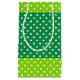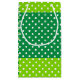A whimsical design that can be used for any occasion, even St. Patrick's Day. The from and back pattern are dark green with a white dot pattern. The top and bottom band is a yellow-green with white dots. Both side panels the bag are made up of green and white stripes.