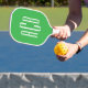 A simple Kelly green and white three letter monogram design on one side of your pickle ball paddle.