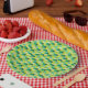 This party paper plate features squares in different shades of green and yellow in a pixelated pattern resembling 16 bit graphics in popular video games.