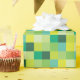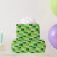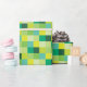 This wrapping paper features squares in different shades of green and yellow in a pixelated pattern.
