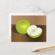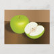 Post card in a digital illustration of a green apple-and-a-half on a textured, coffee brown background