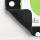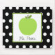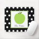 A mousepad featuring an illustration of a green apple inside a white square with green trim. Personalise with your name under apple. Background is black with white polka dots.