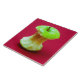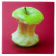 Photo of a big green apple against red background. The apple is eaten out, only the core is left.