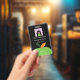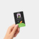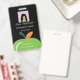 A vertical black badge for any school staff member featuring part of a green apple . Personalise it with the employee's photo , name , job title , school name and the establishment's address . A small white rectangle is provided on the back for the teacher's signature or a bar code . This design is also available in white and light green .