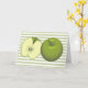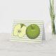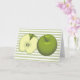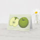 This design features two shiny green apples (one cut in half lengthwise) on a sage green horizontally striped background.