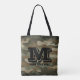Green army camo military camouflage all over print Tote Bag. Woodland pattern design with personalised monogram text. Medium and large size. Custom gifts for friends, family, soldier etc. Double sided print with black handles.