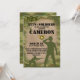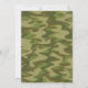 This custom party invitation features a military mission theme. Images of green army men toy soldiers are printed at the bottom, with one in a parachute at the top. A camouflaged pattern borders the images.