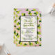 A birthday party invitation with a green avocado pattern created with watercolor paint. This design has one pear-shaped avocado with stem and leaves intact and the other avocado is cut in half exposing its pit. Sitting on a bed of leaves. A semi-transparent frame is layered over top and holds your party information. The background is a vintage style texture in pink and yellow.