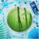 A lush emerald green image of bamboo stalks with long delicate leaves and pale bokeh lights in the background.
