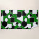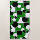 This beach towel has a Bauhaus design of triangles, circles, rectangles, and pentagons in black and white on a field of green.