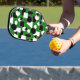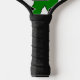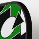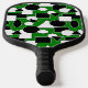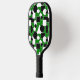 This pickleball paddle has a Bauhaus design of triangles, circles, rectangles, and pentagons in black and white on a field of green.