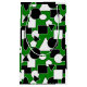 This gift bag has a Bauhaus design of triangles, circles, rectangles, and pentagons in black and white on a field of green.