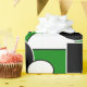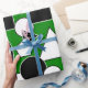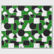 This wrapping paper has a Bauhaus design of triangles, circles, rectangles, and pentagons in black and white on a field of green.