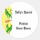 A custom canning or craft label with cute retro green string or snap beans with bean sprinkles, in shades of bright green to blue greens in a pattern with copper orange frying pans on a vintage yellow checked kitchen pattern. This template has two lines for your custom text, click Customise It to add or delete lines, change fonts or background colours!