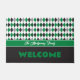 Oversized elegant argyle pattern in school colours of dark green and bright yellow set the backdrop for this design. Welcome in large letters and your family name included. Great idea for a house-warming! Design comes in maroon and grey, burnt orange and grey, red and black, green and black, orange and navy, green and yellow, and purple and grey. Matching products available.