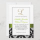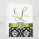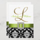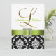 Sophisticated elegance is conveyed by this beautiful wedding invitation design. A black and white floral damask pattern serves as a background for a photo effect of the Metallic Gold Initial "L" and a lime green satin ribbon and diamond brooch ALL PRINTED on FLAT CARD Wedding Invitations. A perfect way to invite your guests to your wedding. Contemporary, yet classic damask pattern with a design which allows you to personalise the front with your names and the back is free to add your customised wedding invitation text. Wedding Invitation is set for monogram initial "L". For other letters and colours please contact designer at luxuryweddinginvitations@gmail.com. Layout Design by Elke Clarke©. Graphics licensed. Also, choose from a variety of fonts and beautiful papers to make your wedding invitations PERFECT!