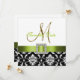 Sophisticated elegance is conveyed by this beautiful wedding Save the Date Card design on a square format. A black and white floral damask pattern serves as a background for a photo effect of the Metallic Gold Initial M and a green satin ribbon and diamond brooch ALL PRINTED on a FLAT CARD Save the Date Wedding Announcement. A perfect way to inform your guests of your upcoming wedding. Contemporary, yet classic damask pattern with a design which allows you to personalise the front with your names and the back is free to add your customised save the date text. The design is set for monogram initial "M". For other letters, different ribbon colour and background please contact designer at luxuryweddinginvitations@gmail.com. Layout Design by Elke Clarke©. Graphics licensed. Also, choose from a variety of fonts and beautiful papers to make your wedding invitations PERFECT!