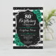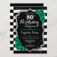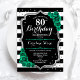 80th Birthday Party Invitation. Elegant floral emerald green design with faux glitter silver and roses. Features black and white stripes and script font. Perfect for a stylish womens bday celebration. Can be customised for any age! Printed Zazzle invitations or instant download digital printable template.