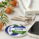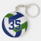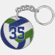 This team colours volleyball themed keychain for girls or boys features the realistic image of a volleyball that has green, blue and white panels, upon which you can customise the player's name and court position, plus school or club name and mascot name on the front and jersey number on the back - by katz_d_zynes