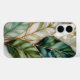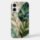 Elegant iPhone case featuring a refined stained glass style botanical leaf design with deep green tones, soft ivory accents, and delicate gold outlines. The structured composition creates a luxurious and modern look that feels both calm and sophisticated.