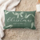 Christmas holiday pillow featuring a trendy green background, beautiful watercolor ribbon and bow, the word "christmas" ina elegant script font, and your family name.