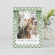 These editable vintage green Christmas photo cards are a perfect way to share the holiday cheer and a merry holiday season. The IRVING Collection features a photo of your family under a Christmas garland adorned with an elegant velvet green bow and ribbons on the front with an editable MERRY CHRISTMAS message in a serif in green and your family's name and the year in a classic serif font in green. An optional backside is included with three family photos and a note, along with a green bow. Dark green ribbons and a christmas garland adorn a vertical photo holiday card that showcases your family photo, with a green garland and ribbon pattern.