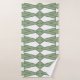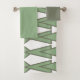 This towel set has a sage green washcloth, a light green hand towel, and a bath towel with an art deco design of triangles and diamonds that look like bowties in light green and sage green.