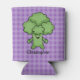 Adorable happy green cartoon broccoli with four florets that make up his hair and a small floret on the end of each stalk to make his arms and hands. he has a big happy smile and closed eye. The background is a purple gingham pattern. Below is a template to add your name.