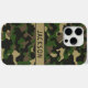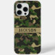 Customise this multi-hued green and brown camouflage iPhone 15 pro case with your name in a trendy modern CAP font in brown on khaki. It's masculine and perfect for your favourite military, hunting, country or outdoorsman!