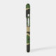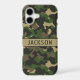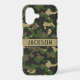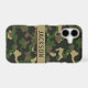 Customize this multi-hued green and brown camouflage iPhone 17 case with your name in a trendy modern CAP font in brown on khaki. It's masculine and perfect for your favorite military, hunting, country or outdoorsman!