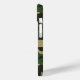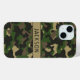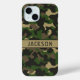 Customize this multi-hued green and brown camouflage iPhone 15 case with your your name in a trendy modern CAP font in brown on khaki. It's masculine and perfect for your favorite military, hunting, country or outdoorsman!