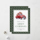 Custom green buffalo plaid Merry Christmas card featuring a classic red truck. Easily personalise this watercolor red truck holiday card with your family name.