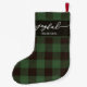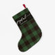 Rustic green buffalo plaid Christmas stocking features festive white joyful script and your custom name.