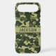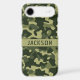 Customize this multi-hued green camouflage iPhone 17 air case with your name in a trendy modern CAP font in dark green on light green. It's masculine and perfect for your favorite military, hunting, country or outdoorsman!