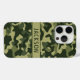 Customize this multi-hued green camouflage iPhone 15 pro case with your name in a trendy modern CAP font in dark green on light green. It's masculine and perfect for your favorite military, hunting, country or outdoorsman!