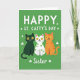 Designed with a rich emerald-green background, this St. Patrick’s Day card features three stylized cats lined up side by side, giving each other the kind of easy, friendly closeness that feels like a sisterly inside joke 💚. On the left is a sleek dark green cat with wide yellow eyes, followed by a white cat dotted with lime-green spots, and then an orange tabby with soft stripes, all wearing matching small smiles. Scattered across the green field are tiny white shamrock shapes that float like confetti ☘️. Across the top, the phrase “HAPPY ST. CATTY’S DAY” appears in large white lettering, centered and easy to read against the dark background. Beneath the cats, the word “Sister” is written in a flowing style in white, placed low and centered under the trio. The flat, vector-like look keeps the shapes simple and the colors solid, with no heavy shading. The cats’ round eyes, curved mouths, and the repeating shamrocks stand out crisply against the deep green backdrop.