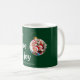 This minimalist design features a classic "Love, Peace and Joy" message, heartfelt wishes, modern and elegant typography on a timeless and classic forest green background. Paired with a playful Christmas bauble photo frame this coffee mug is perfect for anyone seeking truly personalised holiday gift with a joyful touch. Fully customisable with your photo and names. Ideal for spreading Christmas joy with contemporary flair and timeless elegance.