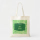 Painting of a green present topped with a green and white striped bow, on an abstract patterned background of yellow, green, and white, with a placeholder for a name, is printed on canvas bags.