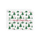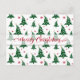 This fun, whimsical design is a repeating pattern of quirky green Christmas trees that seem to dance across the surface. They're topped with wee yellow stars and interspersed with red snowflakes. The words "Merry Christmas" appear over an opaque white strip in red, rendered in a unique script font. This layer is an overlay graphic. Use the template fields to add your return address to the back. Please don't hesitate to reach out for any customisation assistance or special requests.