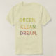 The t-shirt design features the phrase "Green, Clean, Dream" written in bold, multi-coloured letters with a drop shadow. The text is centred on a solid light blue background, creating a vibrant and visually striking composition. The design conveys a message of environmental awareness and a hopeful outlook for a sustainable future.