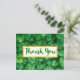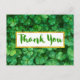 A postcard with a fresh springtime design showing off a field of clover leaves in a lush natural green. Thank you written in the centre on a white frame with a FAUX gold foil border.