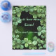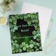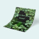 Green and black bokeh background with a few watercolor clovers in the top left corner for good luck. The text is white with green outline and a lighter green or black shadow, fully customisable for a baby shower for a mother to be.