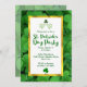 A St. Patrick's Day party invitation with a green clover background and decorative clover illustrations. The invite text is inside a frame with a faux gold foil border.
