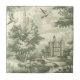 A classic Toile de Jouy pattern ceramic tile in deep muted green featuring rolling countryside scenes, charming village details, and vintage hot air balloons drifting above the landscape. This elegant monochromatic design captures a timeless French aesthetic. Ideal for lovers of traditional décor, cottage style, travel-themed art, and unique vintage-inspired gifts.