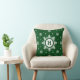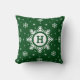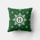 Custom monogram snowflake pillow in Christmas green. Personalised Holidays pillow with white snowflakes. Large snowflake in centre of cushion where you can add your initial. Unique Christmas home decor accessory pillow - personalised with your monogram.