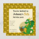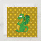Birthday print invites with illustration of a green dragon guarding a treasure, on seamless golden yellow pattern with stars; suitable for boys and girls