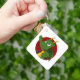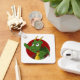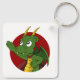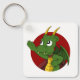 Keychain with illustration of head of a cute little green flying dragon, in red circle, cute fantasy / fairy-tale design for kids by Maxi Harmony