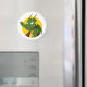 Magnet with illustration of head of a cute little green flying dragon, in yellow circle, cute fantasy / fairy-tale design for kids by Maxi Harmony