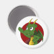 Magnet with illustration of head of a cute little green flying dragon, in red circle, cute fantasy / fairy-tale design for kids by Maxi Harmony