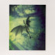 This fantasy art puzzle features a green forest nature scene with a magical green dragon flying overhead.